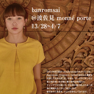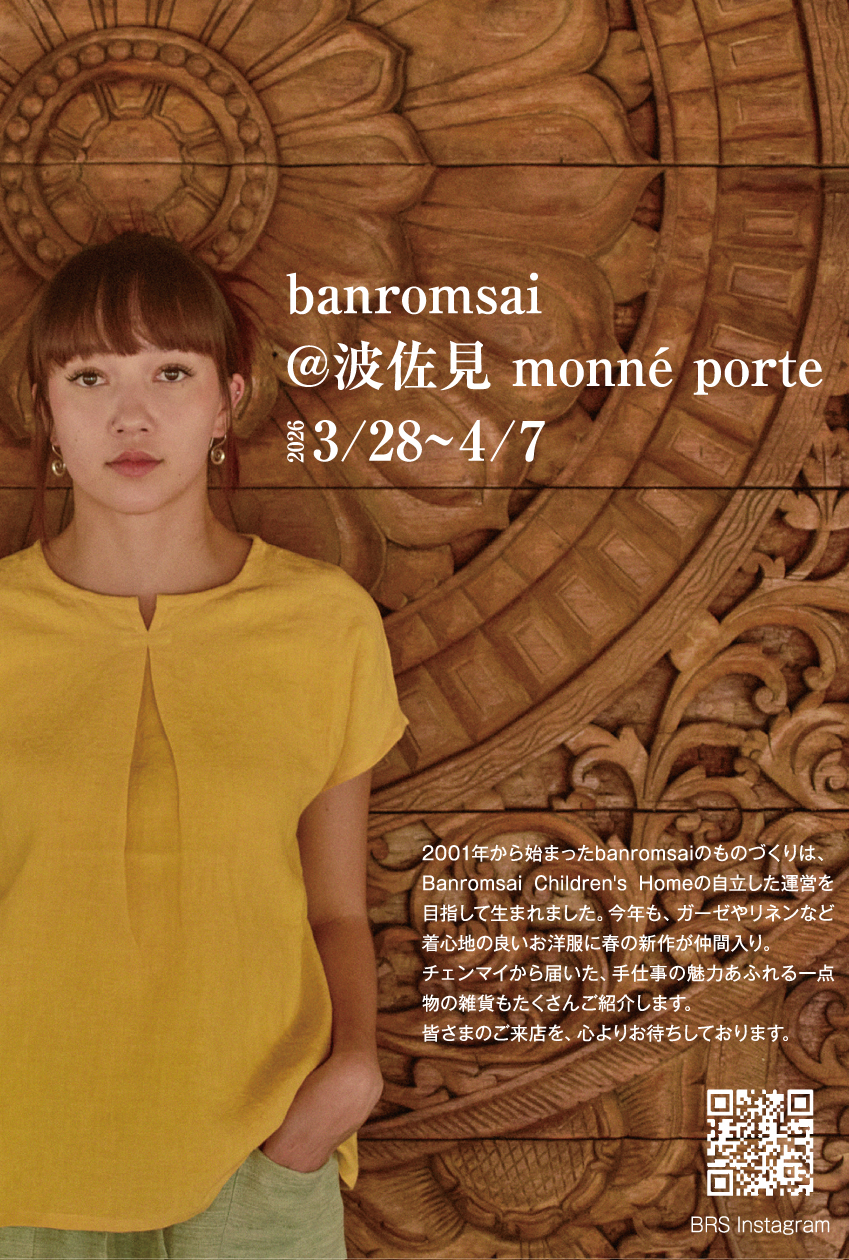 2026年3月10日 / イベントのお知らせ @ monné porte 今年も毎年恒例のバーンロムサイ展がやってきます。 春にふさわしいお洋服やタイの雑貨などがたくさん届きます。 お近くの方はぜひ足をお運びください。 ※なお、DMでモデルさんが着用されているお洋服は在庫切れ中です。 カラー違い・生地違いの商品は納品予定です。 ----- 2026年3月28日(土)〜4月7日(火) 11:00-18:00*4月1日(水)休 バーンロムサイHP バーンロムサイInstagram Tweet